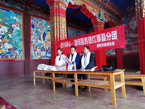 为认真贯彻落实省委推进藏区依法治理常态化的重大决策部署,2021年8月2日至8月5日,德阳市律协副会长、德阳同心团红原分团团长李漪率四川同心·律师服务团红原分团一行11人赴阿坝州红原县开展实地法律服务活动。市律协副会长、同心团副团长宋渝伟,副监事长、同心团副团长温俊,市委统战部无党派人士和党外知识分子工作科科长、新的社会阶层人士工作科科长饶旭伟参加活动。
